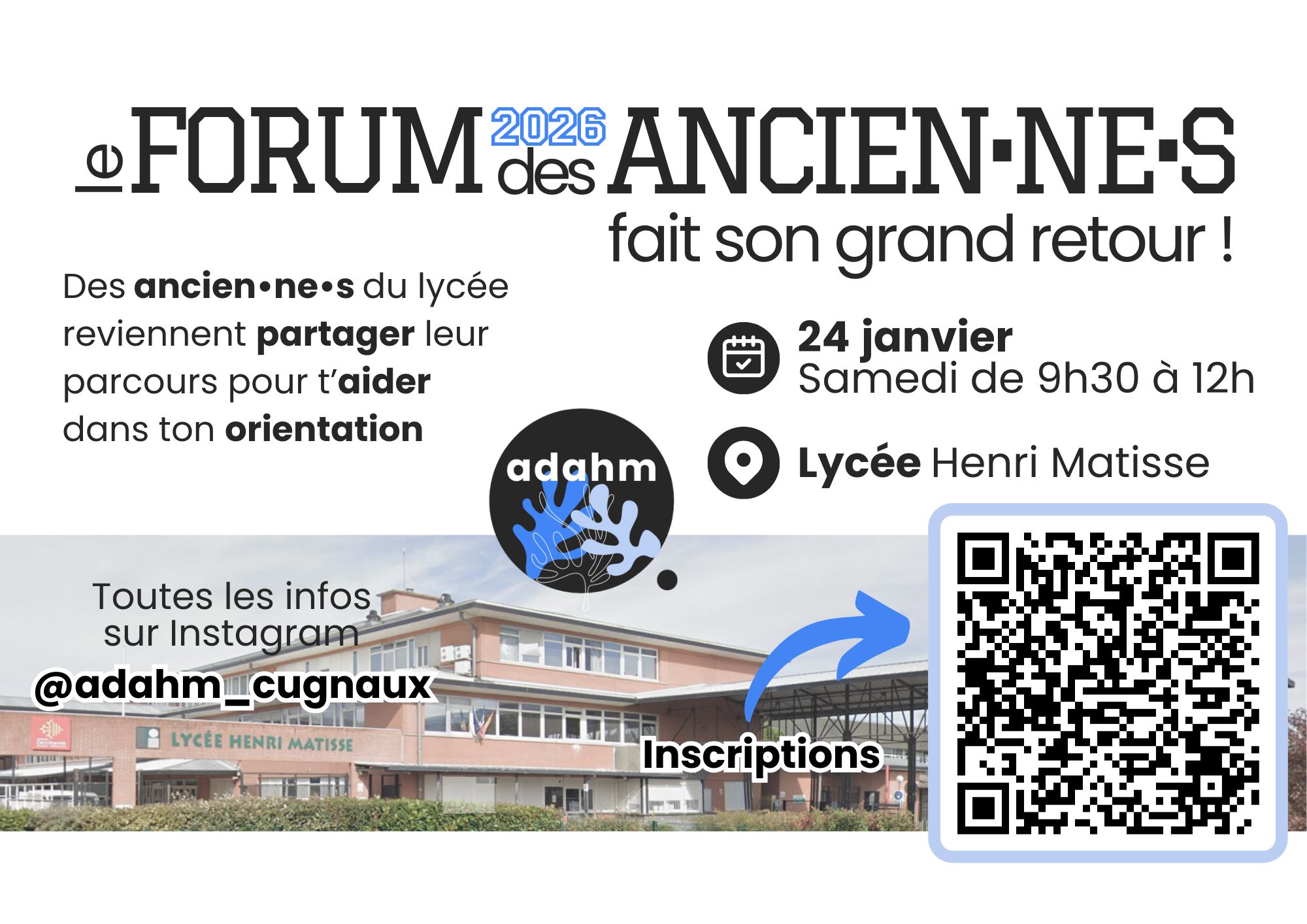 L’Association des Ancien·ne·s du Lycée Henri Matisse a le plaisir de vous annoncer la tenue de la troisième édition de son Forum des ancien·ne·s, qui aura lieu le samedi 25 janvier de 9h à 12h au sein du lycée.